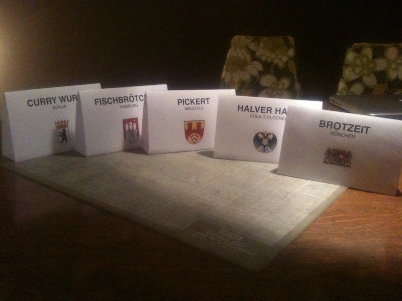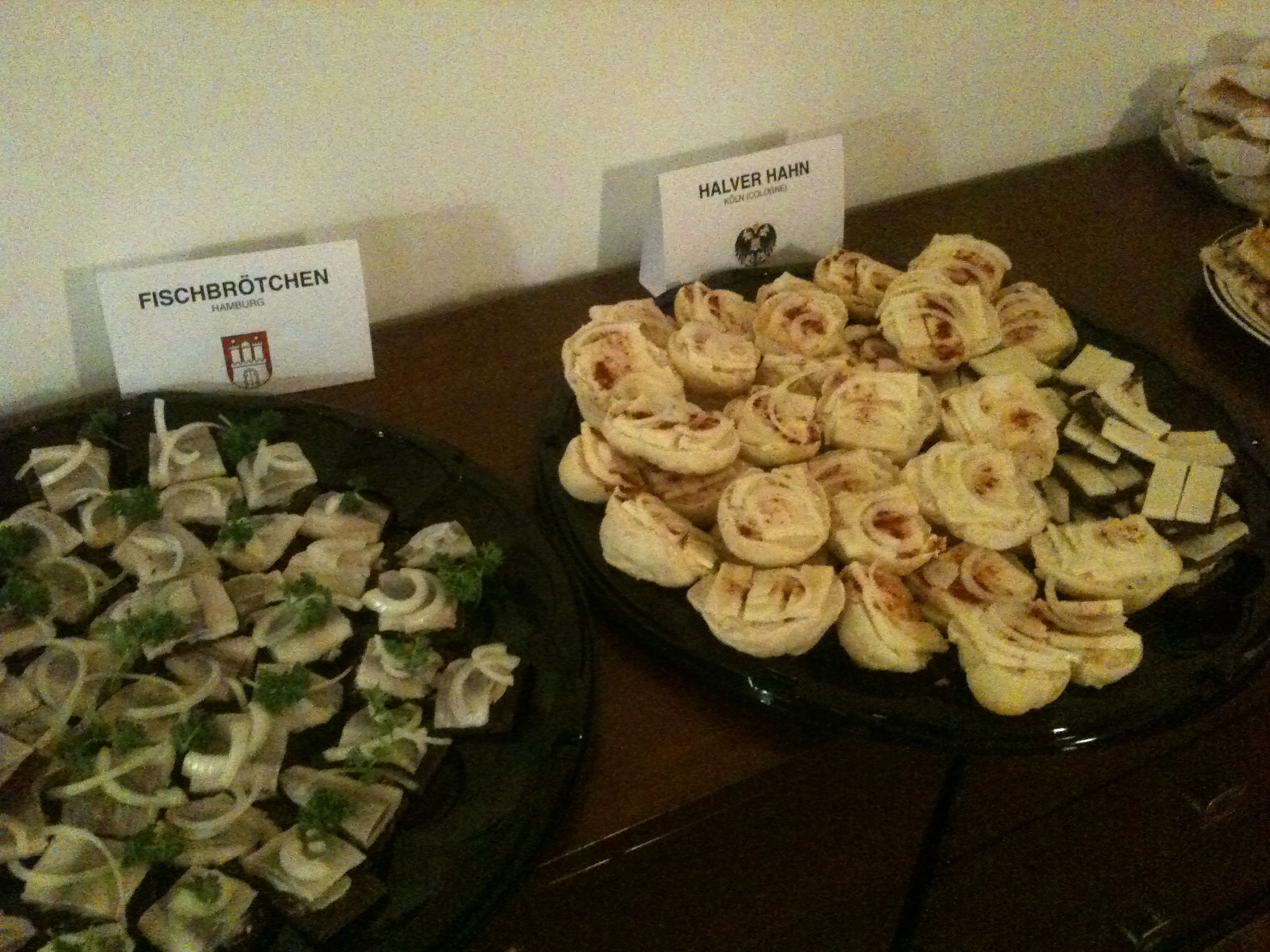 Aus Berlin die Currywurst (mit der Kultsauce vom Drachenfels), aus Hamburg Matjesschnittchen (Pumpernickel mit Butter, eingelegtem Hering und Zwiebelringen), aus Bielefeld westfälischer Pickert (pfannkuchenähnlicher Puffer mit geriebenen Kartoffeln und Rosinen im Teig, dazu Leberwurst und Graftschafter Zuckerrübensirup), aus Köln Halver Hahn (Käse auf selbstgemachten Brötchen mit Paprikapulver und Zwiebeln) und aus München Obatzda, dazu unser Spezialbrot, Gurken, Radieschen,Teewurst… Und der Glühwein kam an dem kühl regnerischen Novemberabend auch gut an.
